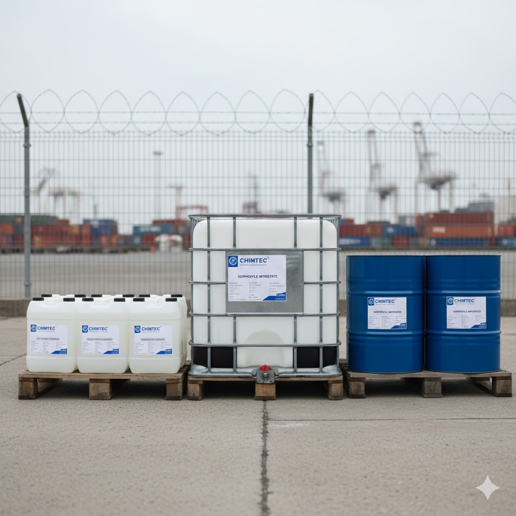 Isopropyl myristate (C₁₇H₃₄O₂) is an ester of myristic acid and isopropanol used as an emollient and solvent in skin care, massage oils, and hair products.
