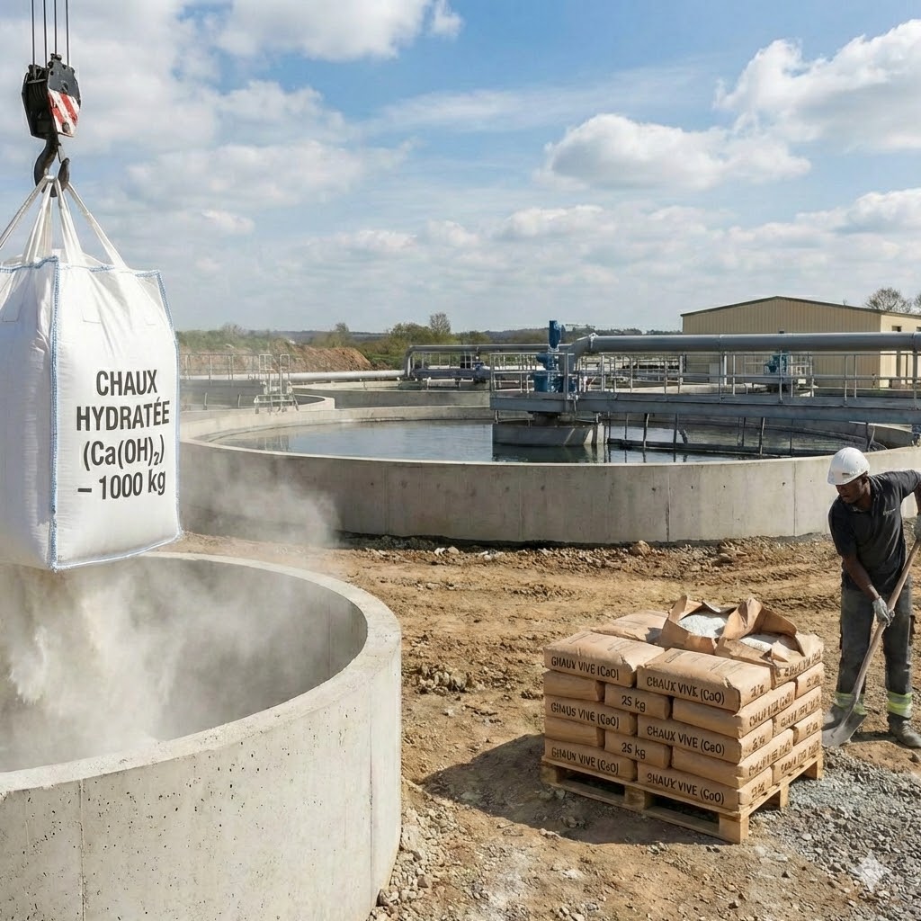 Hydrated lime, supplied as a fine white powder, is particularly suitable for neutralizing acidic effluents. Quicklime, with higher alkalinity, is used where strong pH correction is required.