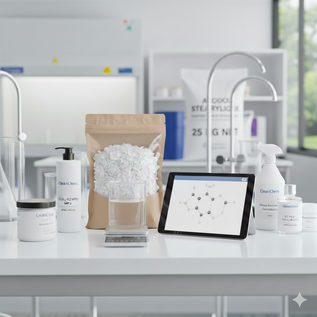 L’alcool stéarylique (C₁₈H₃₈O) est un alcool gras solide, obtenu à partir d’huiles naturelles, utilisé comme co-émulsifiant, agent de texture et conditionneur dans les crèmes, lotions et après-shampoings.
